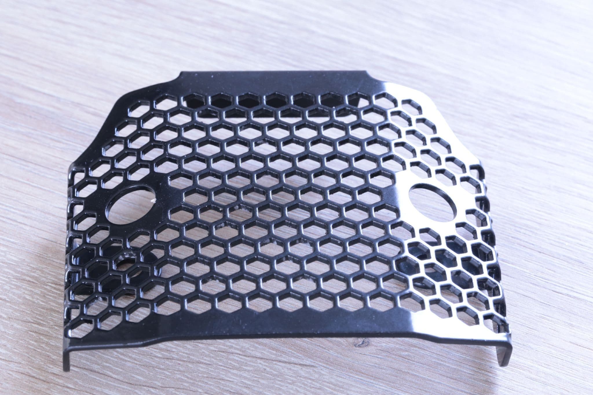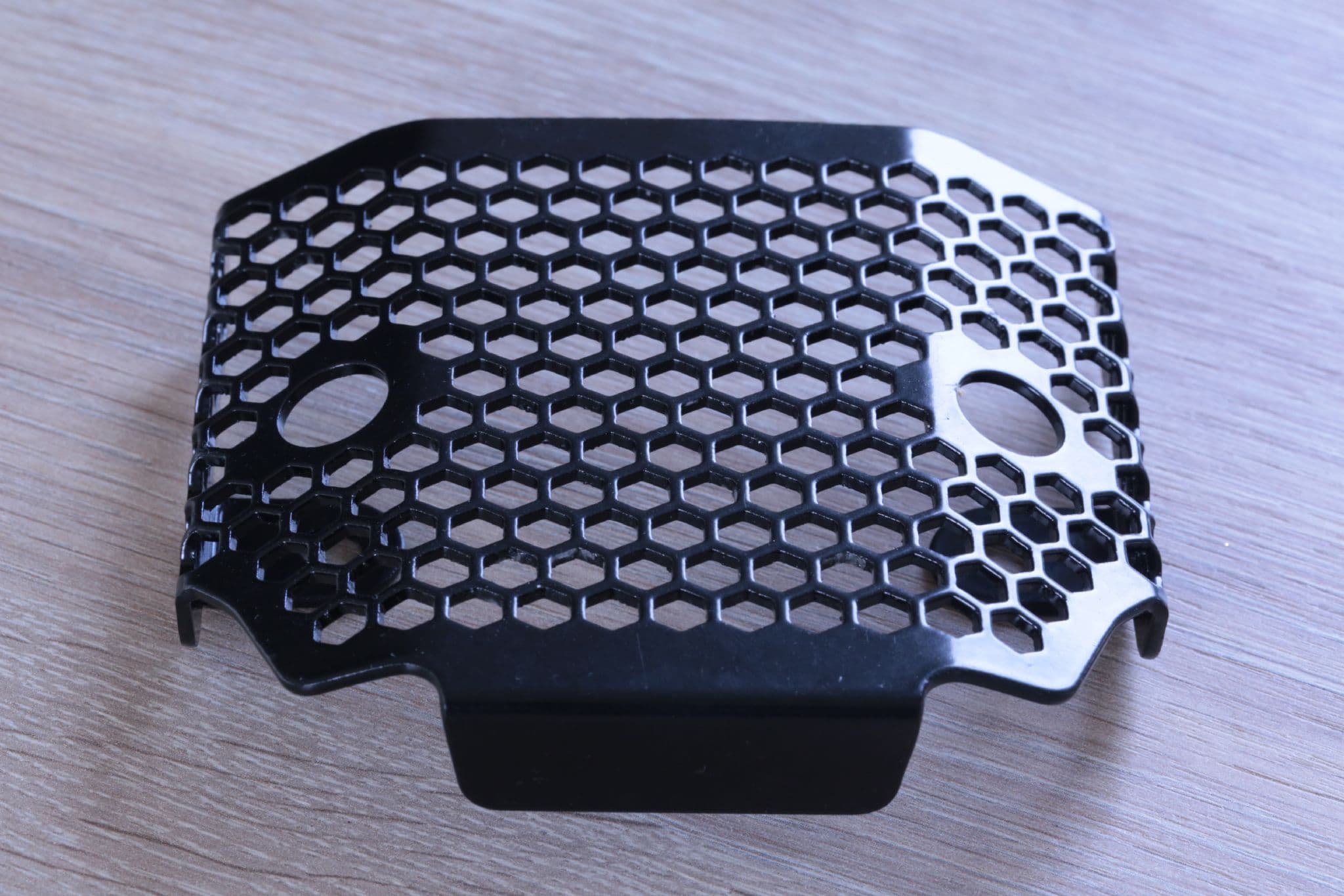 Hexagonal hole pattern to optimise airflow whilst providing maximum protection from road debris.CNC machined from aircraft quality aluminium.